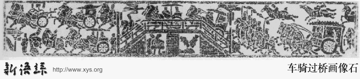 • (东汉)车骑过桥画像石。山东苍山出土,现藏苍山县文物保管所。