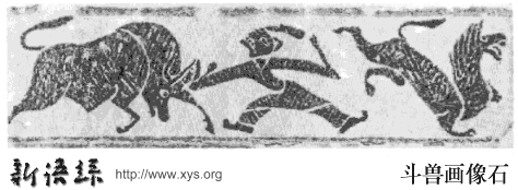 • (东汉)斗兽画像石。河南南阳出土,现藏南阳汉画馆。
