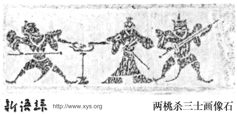 • (东汉)两桃杀三士画像石。河南南阳出土,现藏南阳汉画馆。