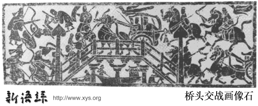 • (东汉)桥头交战画像石。山东苍山出土,现藏苍山县文物保管所。